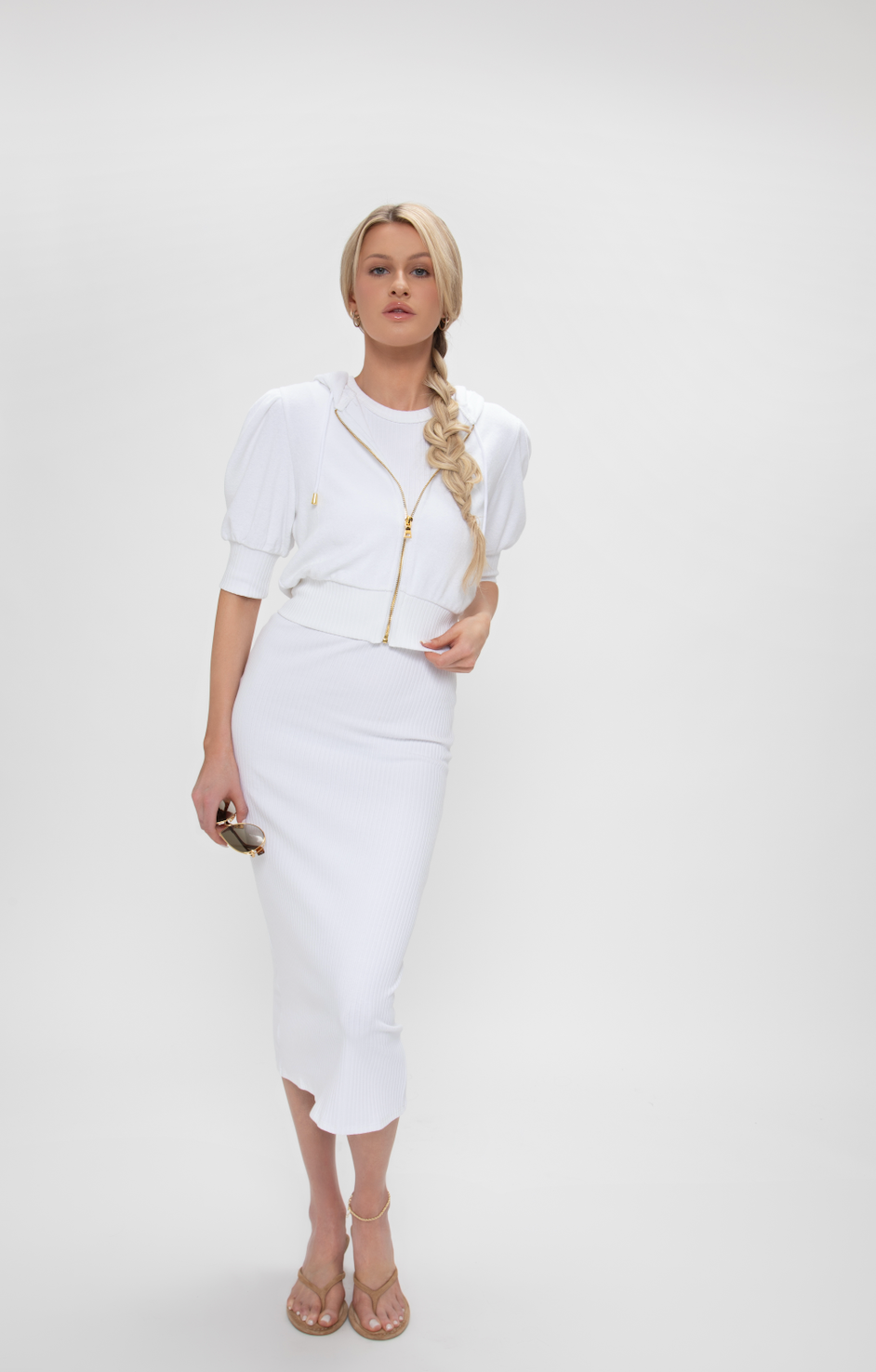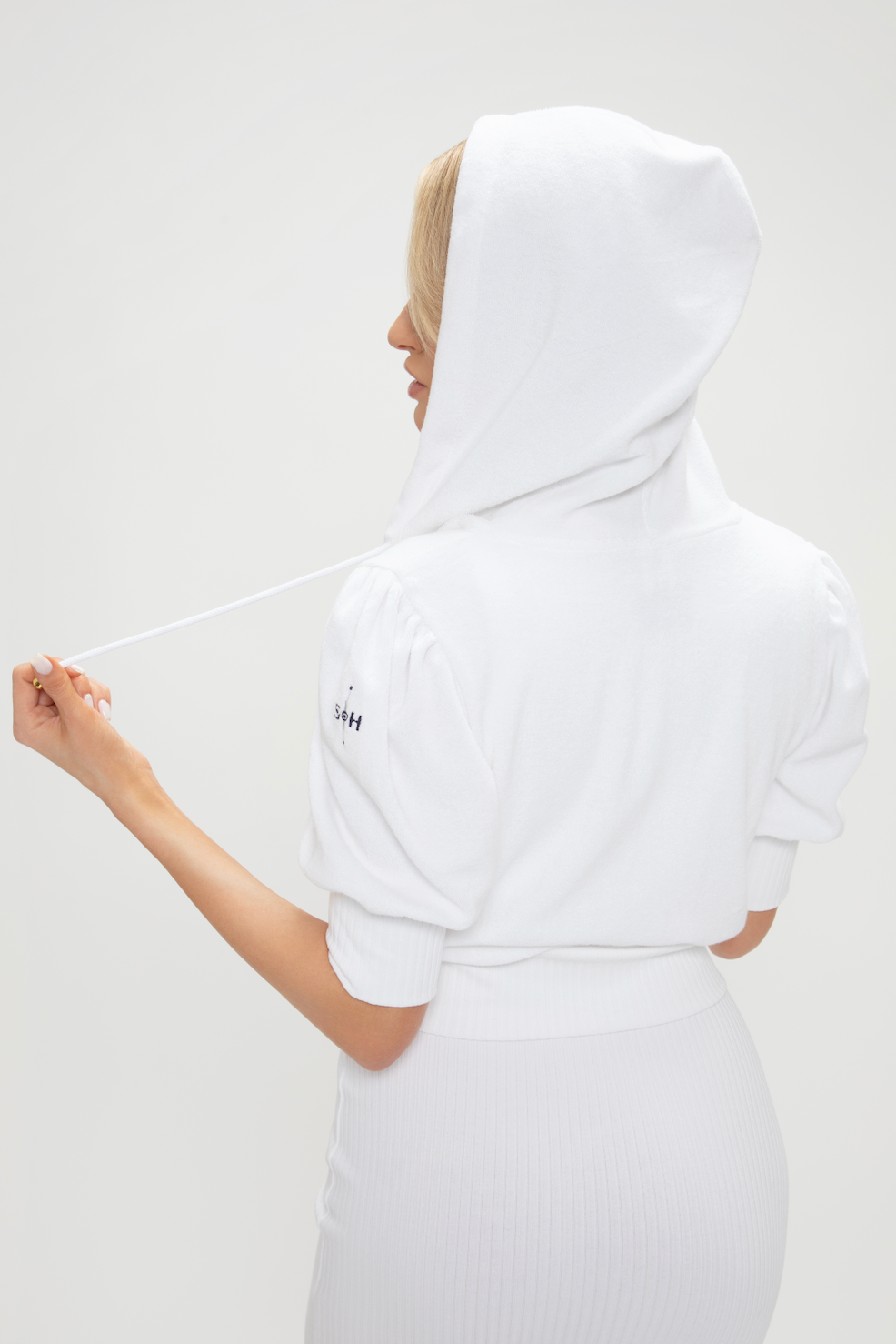 Lightweight and ready for takeoff, the Cherub Hoodie is your go-to post-flight layer. Crafted from ultra-soft, sustainable toweling fabric, it offers first-class comfort with a cropped silhouette and relaxed hood. Available in a brilliant Optic White and smooth Heather Grey, it’s the perfect piece to throw on as you taxi into the weekend. (seen here with the Halo Dress to complete the full look).